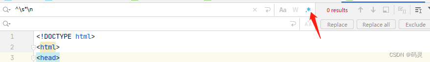 编写软著时,提供的源代码不能有空行Ctrl +R 召唤出替换框,选中正则表达式,替换即可。^\s*\n