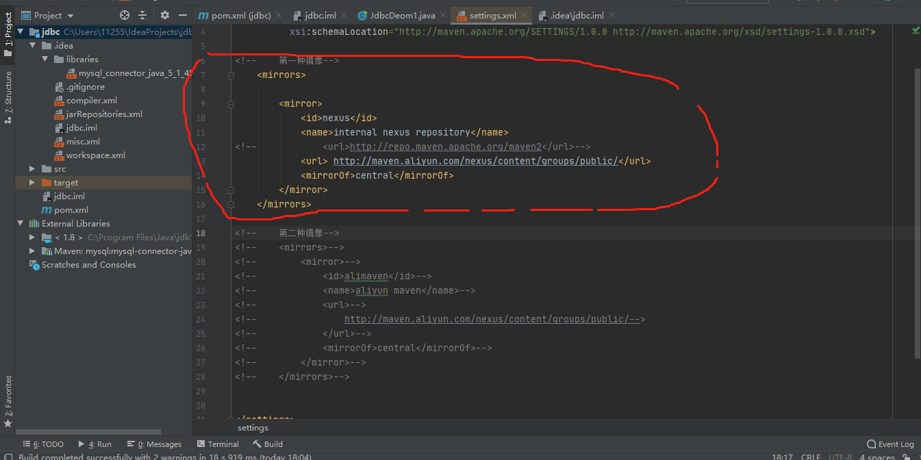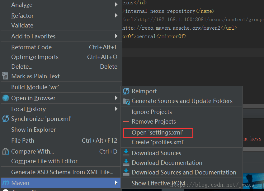 点击Open’settings.xml’ , 刚开始这个位置是Create ‘settings.xml’ ,打开之后添加在里面添加镜像服务器: