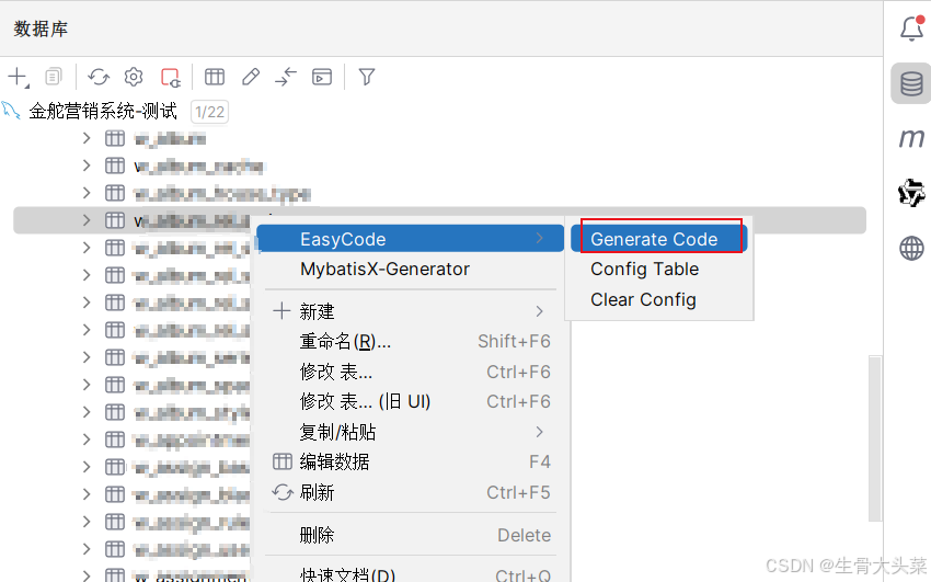 连接成功后,这时候我们可以选择其中一个表,右键:EasyCode --> Generate Code,来快速生成 entity 、mapper、service、controller 等文件。