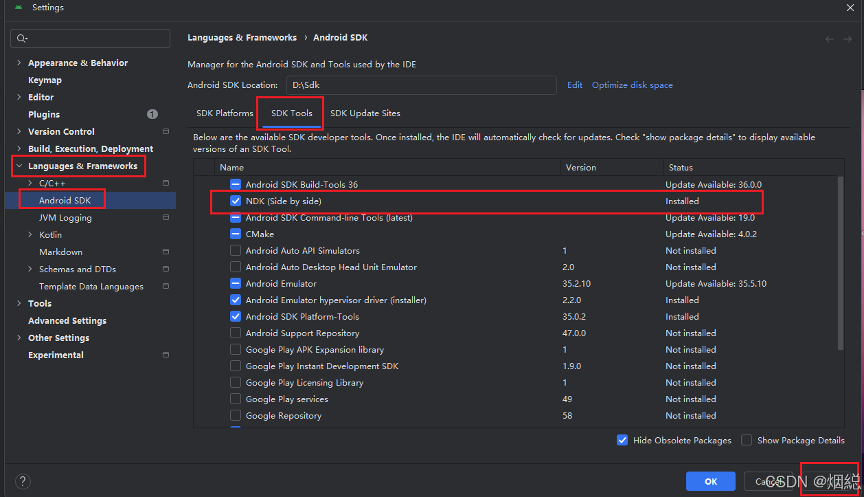 打开 languages & frameworks - android SDK - SDK Tools - NDK