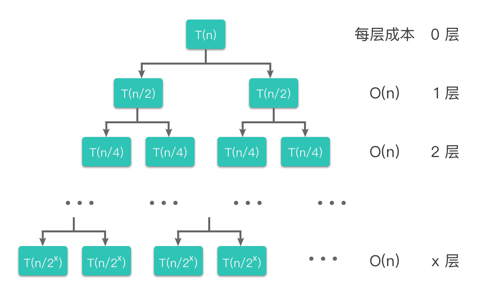 $时间复杂度 = 叶子数 * T(1) + 成本和 = 2^x \times T(1) + x \times O(n)$。