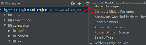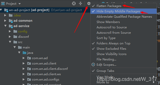 idea打开工程的时候包名叠在一起了点击箭头处按钮,把第一第二行勾去掉如下最终效果