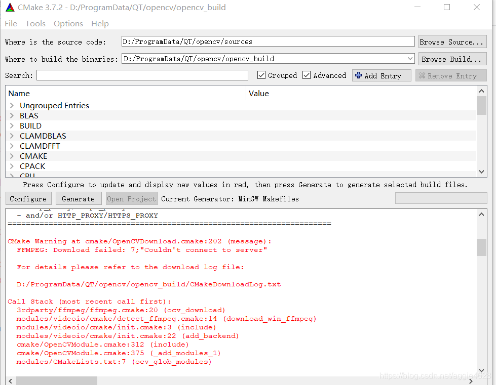 CMake编译时出现以下错误:=======================================================================CMake Warning at cmake/OpenCVDownload.cmake:202 (message):FFMPEG: Download failed: 7;"Couldn't connect to server"F