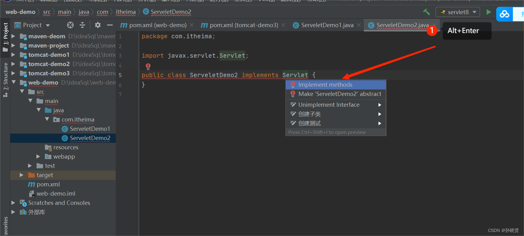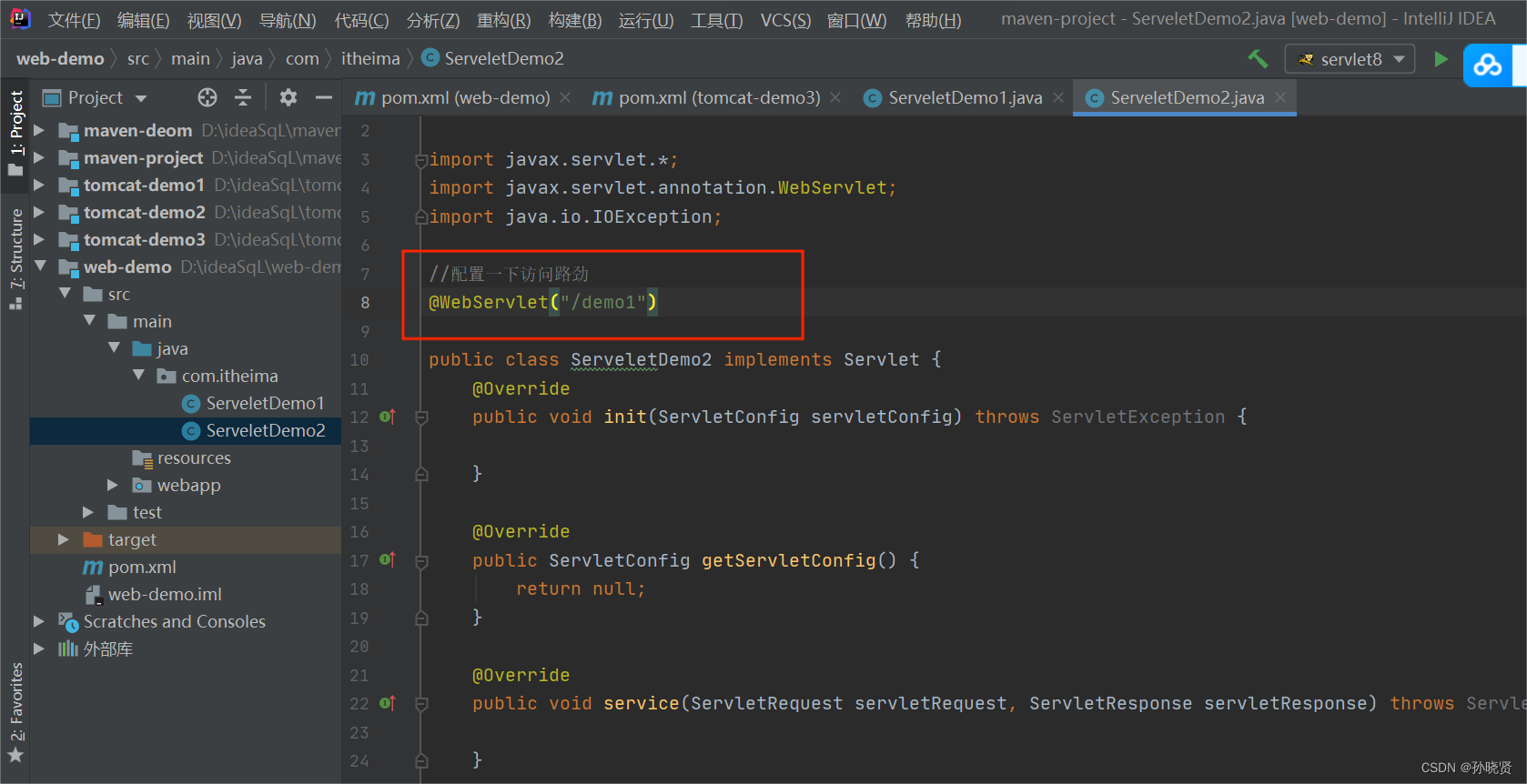 2.创建:定义一个类。实现Servlet接口,并重写接口中所有方法,并在service方法中输入一句话