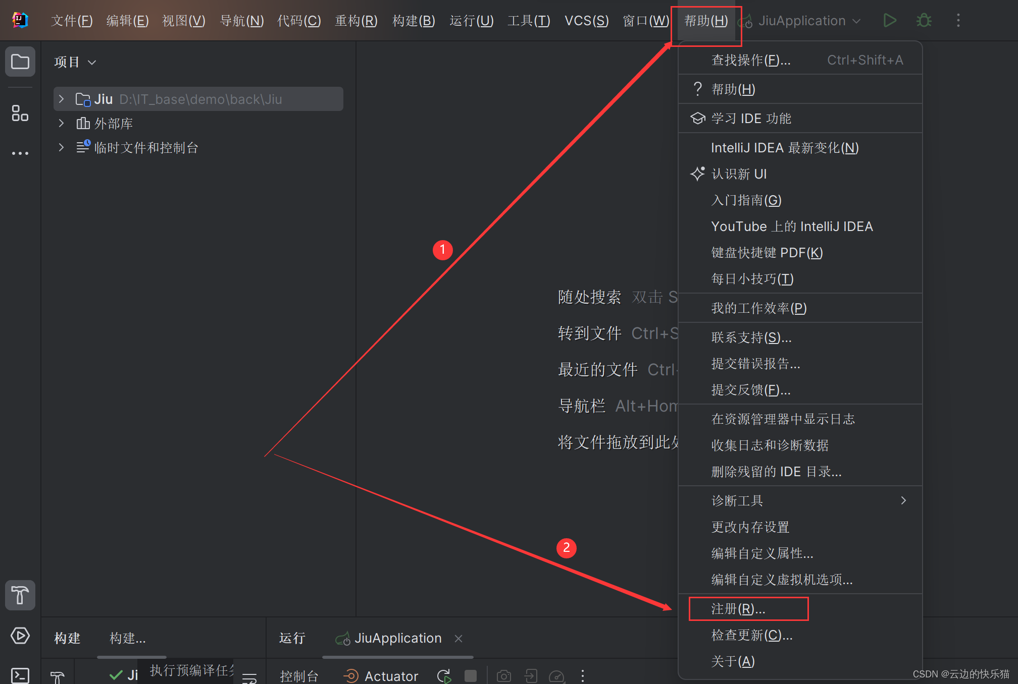 当自己的idea日期要到了,又想续上,但是覆盖不了之前的日期,新的没办法生效。那么就要把原先的许可证先移除,再重新续上新的。点击idea的右上角的这个展开。选择帮助---点击注册。