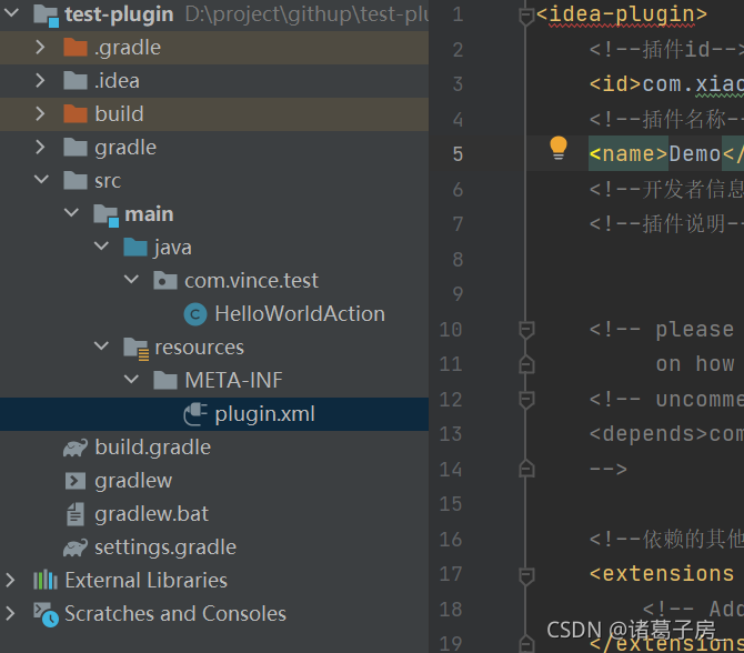 1.需要安装gradle参考:Gradle的安装与配置_wenchang-的博客-CSDN博客_gradle安装2.插件开发3.项目目录4.plugin.xml<idea-plugin><!--插件id--><id>com.xiaokai.test.demo</id><!--插件名称--><name>Demo</name