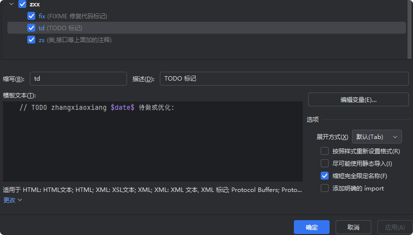 这步骤会和后面的模板user变量取值有关,所以先设置它.找到idea安装的bin目录下找到idea64.exe.vmoptions(或者idea.exe.vmoptions),添加内容: -Duser.name=zhangxiaoxiang zhangxiaoxiang(当然你改成你的名字就行了哈)