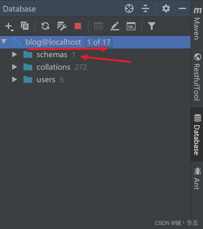 6.此时你会发现在右侧的Database中有我们刚刚添加的这个MySQL数据库。你的数据库就在schemas菜单中。
