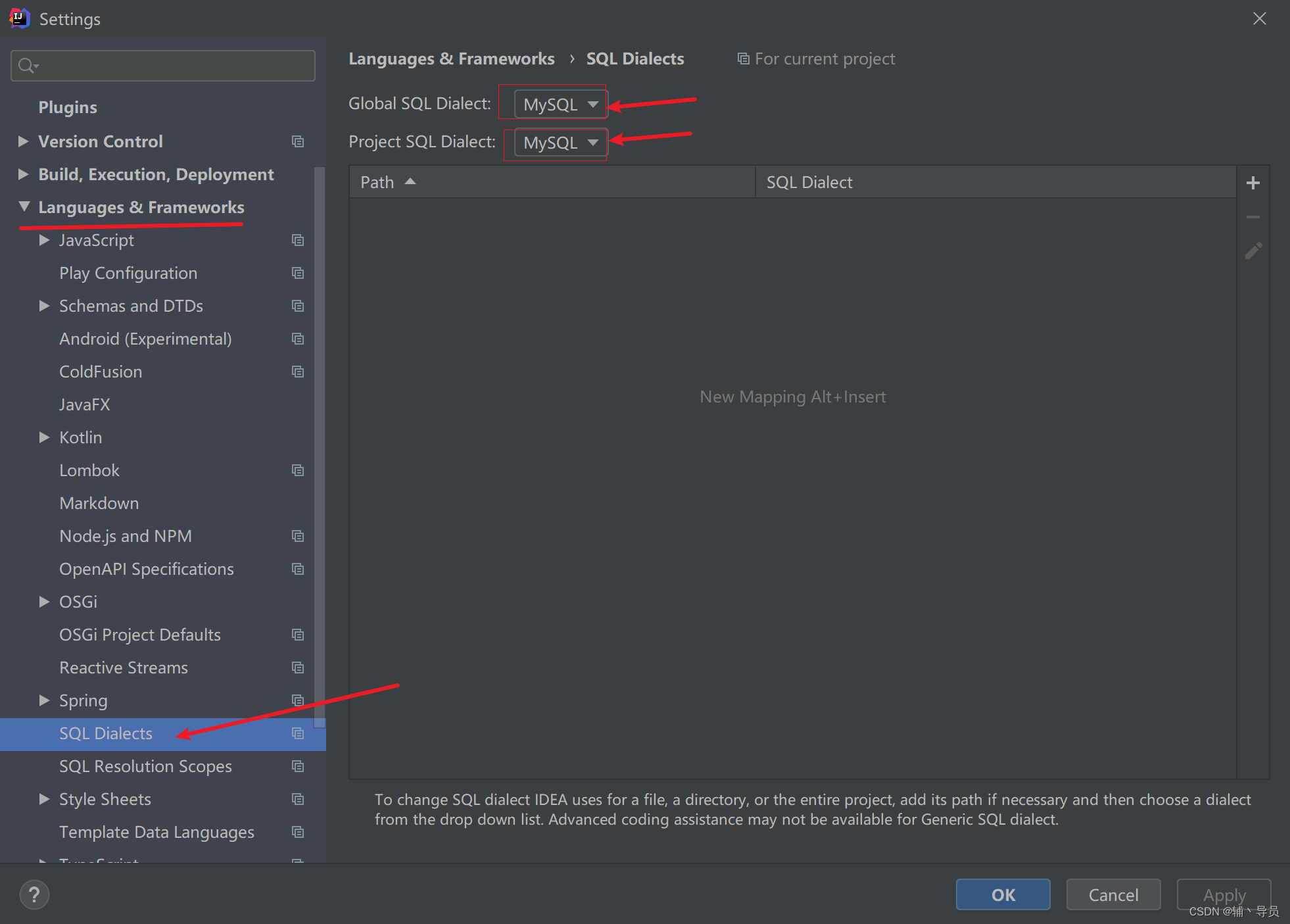 9.如果你发现IDEA链接Mysql数据库后,编写mapper.xml不会自动提示表信息。那么检查一下Settings --> Languages & Frameworks --> SQL Dialects中,确保这两个SQL Dialect 都是选择的 MYSQL(或其中一个),而不是None;