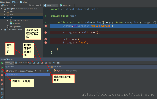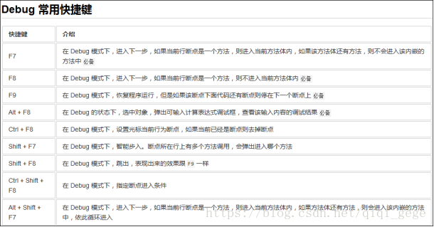 比较常用的有:F7跳到下一步;F8跳到下一个断点;F9回复程序运行,如果该断点下面代码还有断点则停止在下一个断点上;Shift+F7:进入断点执行处的方法