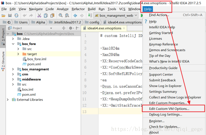 IDEA默认配置的JVM内存值比较低,如果硬件配置较高,可以修改该设置.