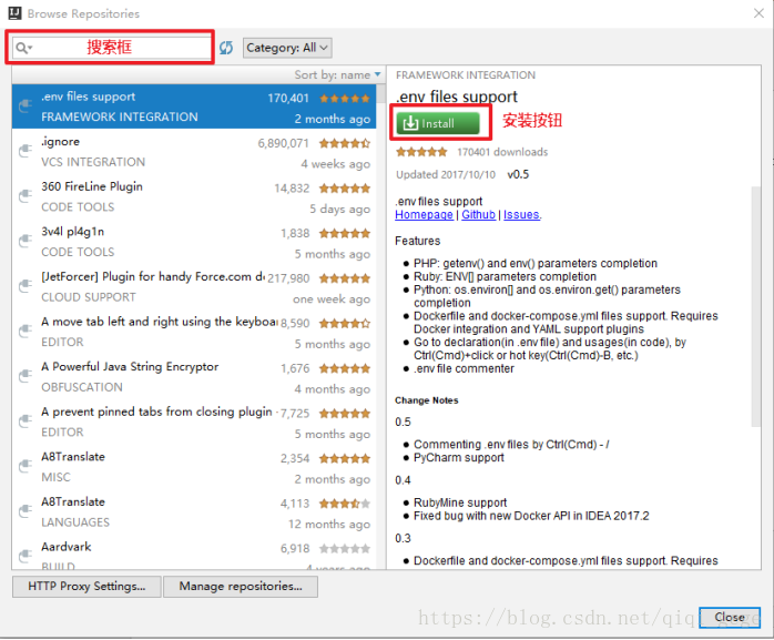 安装官方插件和第三方插件时,可以使用上图中的搜索框进行搜索,找到对应插件后,使用右侧的安装按钮进行安装,安装结束后重启IDEA即可生效