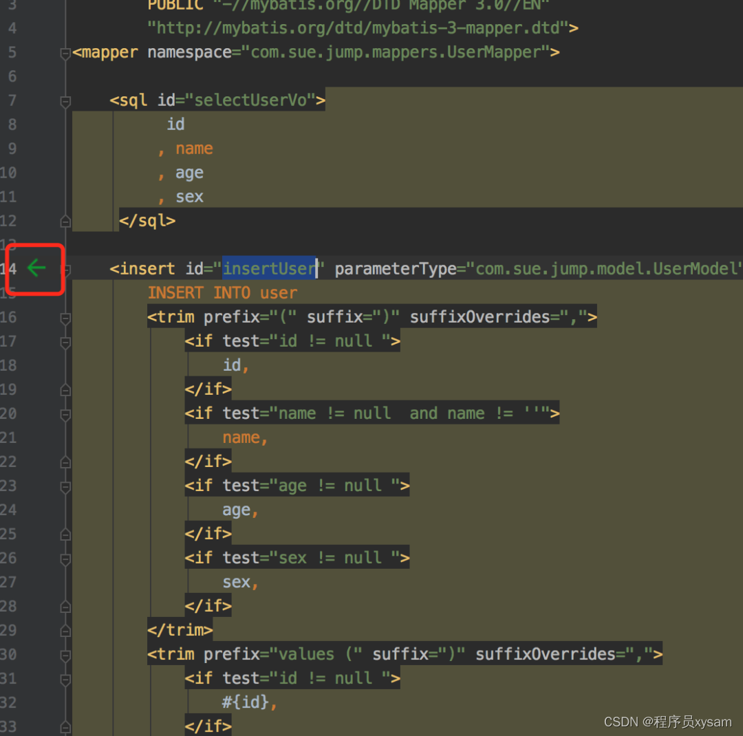 此外,在UserMapper.xml文件的insertUser语句的左边,也会多出一个绿色的箭头,我们点击该箭头,也能跳转到UserMapper接口的insertUser方法上。