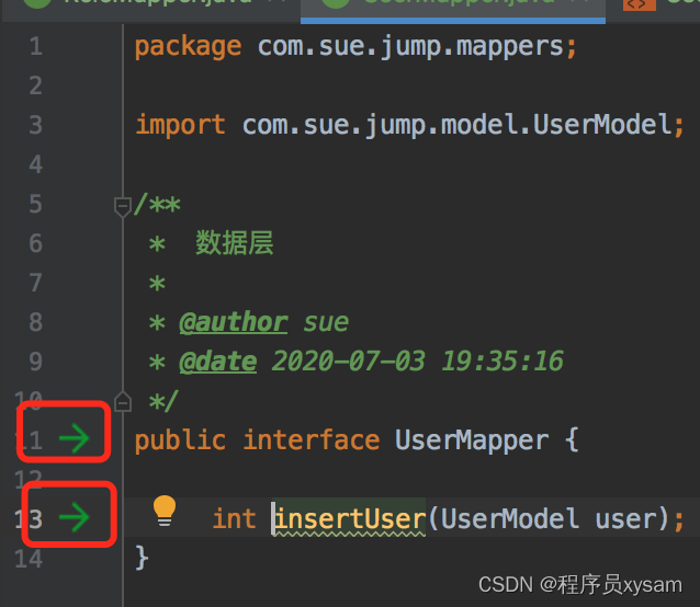 安装了该插件之后,在UserMapper接口的接口名和方法名的左边,会多了两个绿色的箭头,我们点击该箭头,就能跳转到UserMapper.xml文件对应的mapper标签或者insertUser语句上。