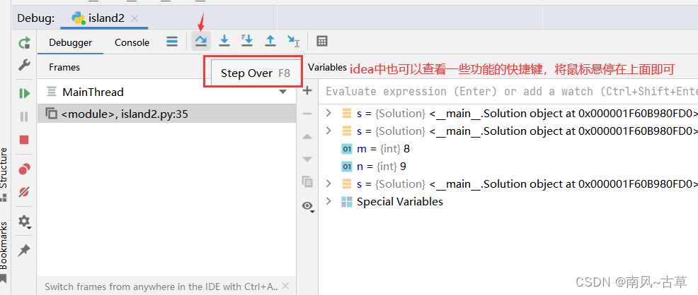 idea调试常用的快捷键一、F7 步入调试,进入当前函数内部。二、F8 步过调试,在当前函数块中,跳到与该行代码并列的下一行代码。三、F9 跳到自己标记的下一个断点处。四、调试常见问题举例:在调试过程中,初学可能会出现连续多次按快捷键,却没啥反应的现象。图一(问题的抛出和解决方法):图二(完成输入后的效果):图三(调试数据的针对性查看):图四(idea中部分快捷键的快速查看):补充:我个人的电脑需