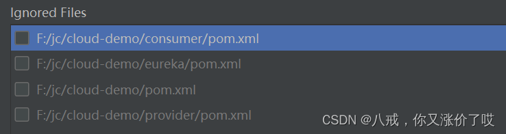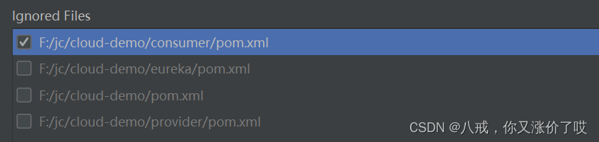 如下:给模块取错名字了,改名的时候不知道点到了什么,一个模块的pom.xml变成灰色了。可以看到,consumer模块的pom.xml文件被忽略了,把勾选点掉。在Settings里打开以下路径。再点击应用,就可以啦。