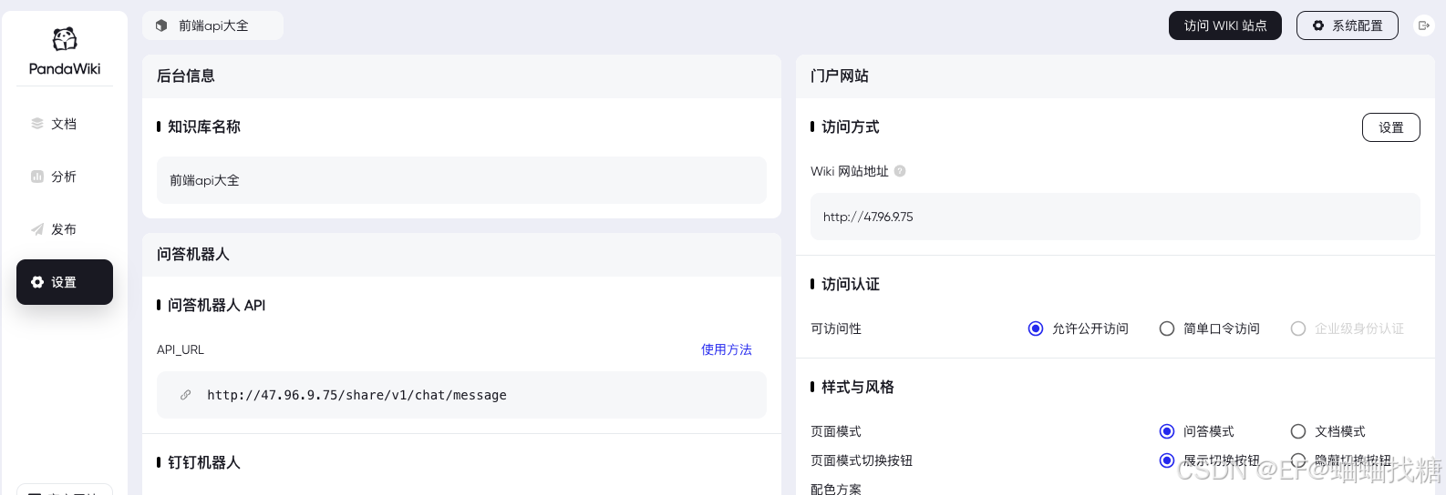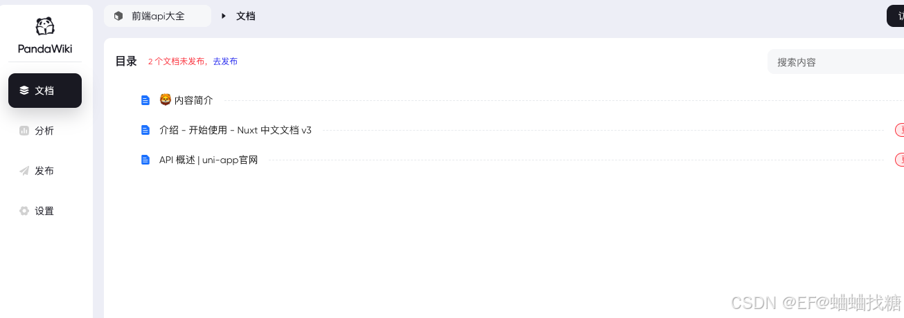 顺利完成了以上步骤,属于自己的 PandaWiki 搭建成功!随时补充知识库的内容,优化目录结构。可以在开发过程中帮助我们迅速定位到所需api内容,省时省力。