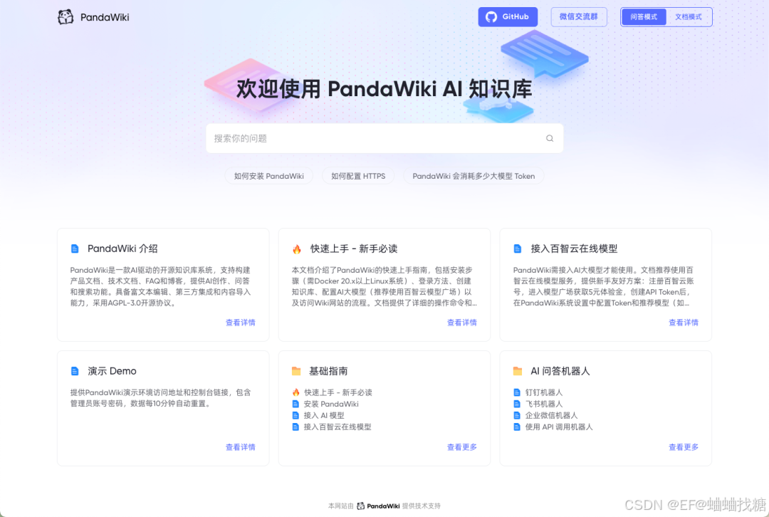 有了需求,展开调研,很快找到一款 AI 大模型驱动的开源知识库搭建系统:PandaWiki