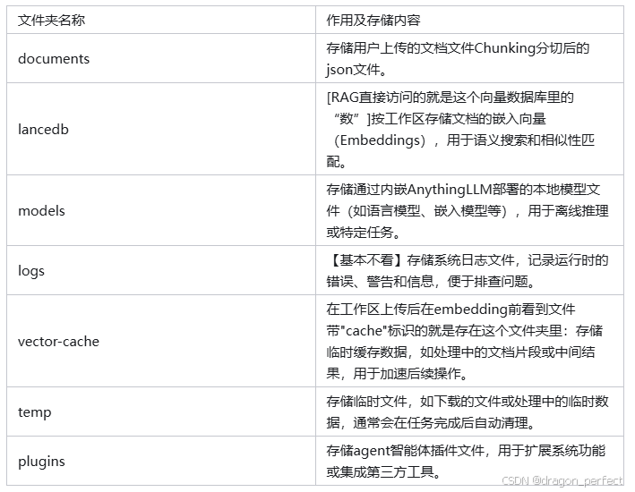 AnythingLLM (1.7.x 版本) Storage各文件夹存储内容整理如下: 以下是 AnythingLLM 本地存储文件夹 Storage 中子文件夹的整理表格,包含各文件夹的作用和存储内容: