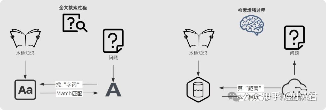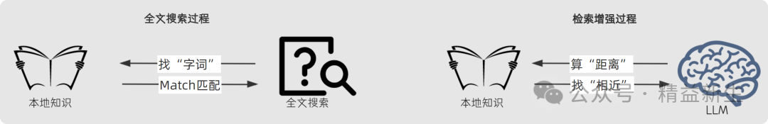 RAG检索增强生成独特之处,就在与对本地知识的“学一下”和“找一找”。 那RAG检索增强的“学一下”和“找一找”和最直接的全文搜索查找有何不同呢? 据我的理解,全文搜索和增强检索“路径不同”,前者是通过直接的“找字词、对对碰”的方式查找并匹配,后者是通过 “算距离-找相近”的方式“学习并检索”。