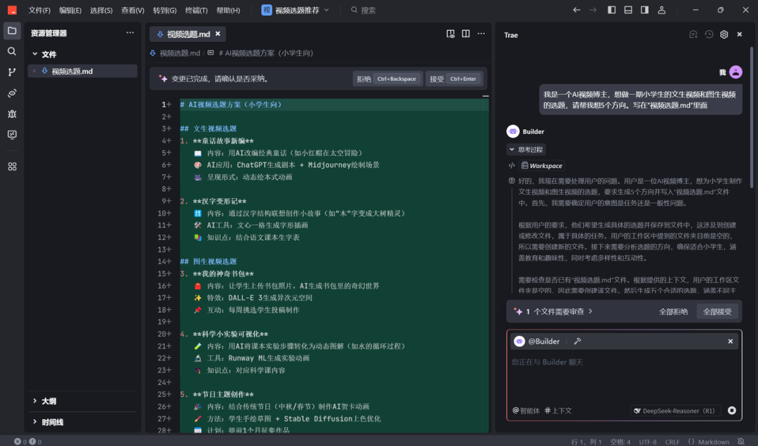 分享一个用 Trae 使用 Deepseek 模型的科研小技巧,可能不需要在多个AI平台来回切换了,直接在这个平台就可以进行。我平常会使用聊天功能 (deepseek r1 推理模型)来讨论,讨论需求、讨论选题、头脑风暴... 然后使用 @Builder模式 让它基于讨论的内容去生成、执行、写 python 代码、写 md 文档,科研yyds!解放生产力!