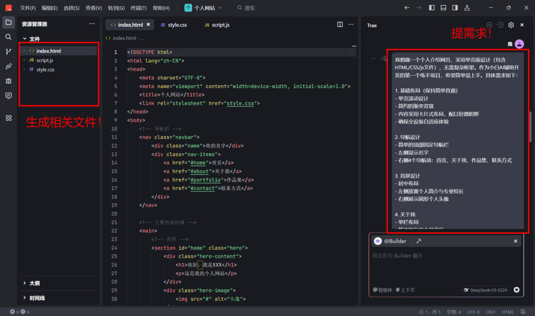 - 当我们需要建立项目,让 AI 对项目、代码直接进行编辑、修改、建立,我们 @Builder调用智能体,然后再进行给出需求(相当于原 Builder 模式):