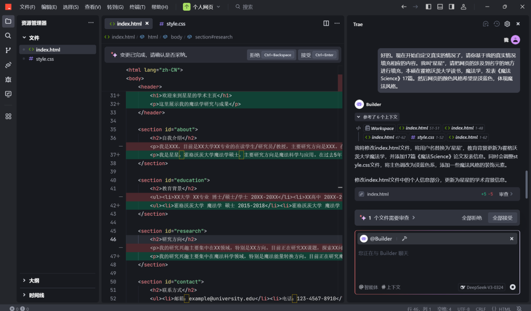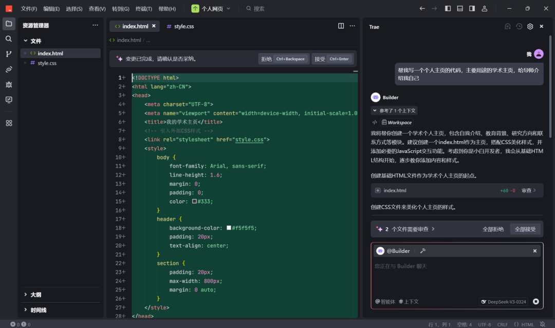 想象一下,你有一个能把你的创意变成现实的造梦AI助手。不管你是想利用 AI 提高办公效率、开启科研提效模式,利用 AI 提高编程效率,还是做一个小游戏、开发一个网站,甚至自己尝试做一些复杂的工程项目,即使你不懂编程,Trae 都能帮你实现。它接入了Deepseek r1,v3,豆包大模型,只为满足不同的使用场景!(亲测好用!!小白友好!!)