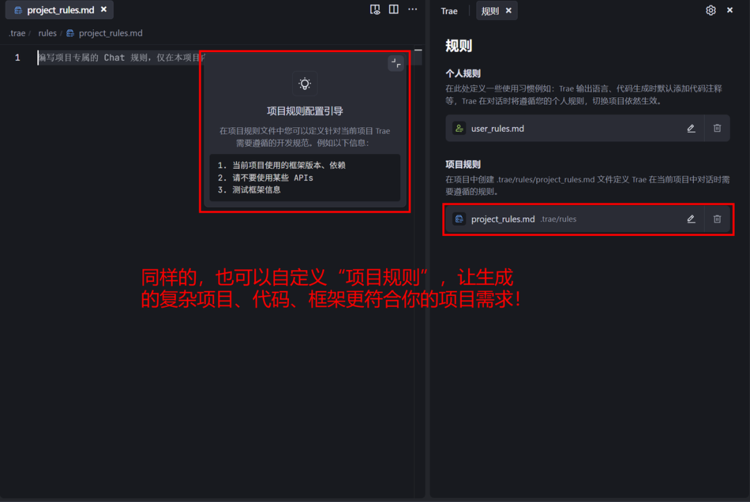 如何和 Trae 协作? 那么我们可以个性化一些规则,比如说清楚我们是小白/专业级的开发者,它会根据不同的个性化来进行输出。如果你是小白,它会始终保持通俗易懂的语言进行输出;如果你是专业的开发者,那么它也会保持严谨精确的语言进行输出,总之,来自定义个人的规则吧!