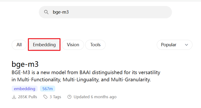 BGE (BAAI General Embedding) 专注于检索增强llm领域,经本人测试,对中文场景支持效果更好,当然也有很多其他embedding模型可供选择,可以根据自己的场景,在ollama上搜索“embedding”查询适合自己的嵌入模型。