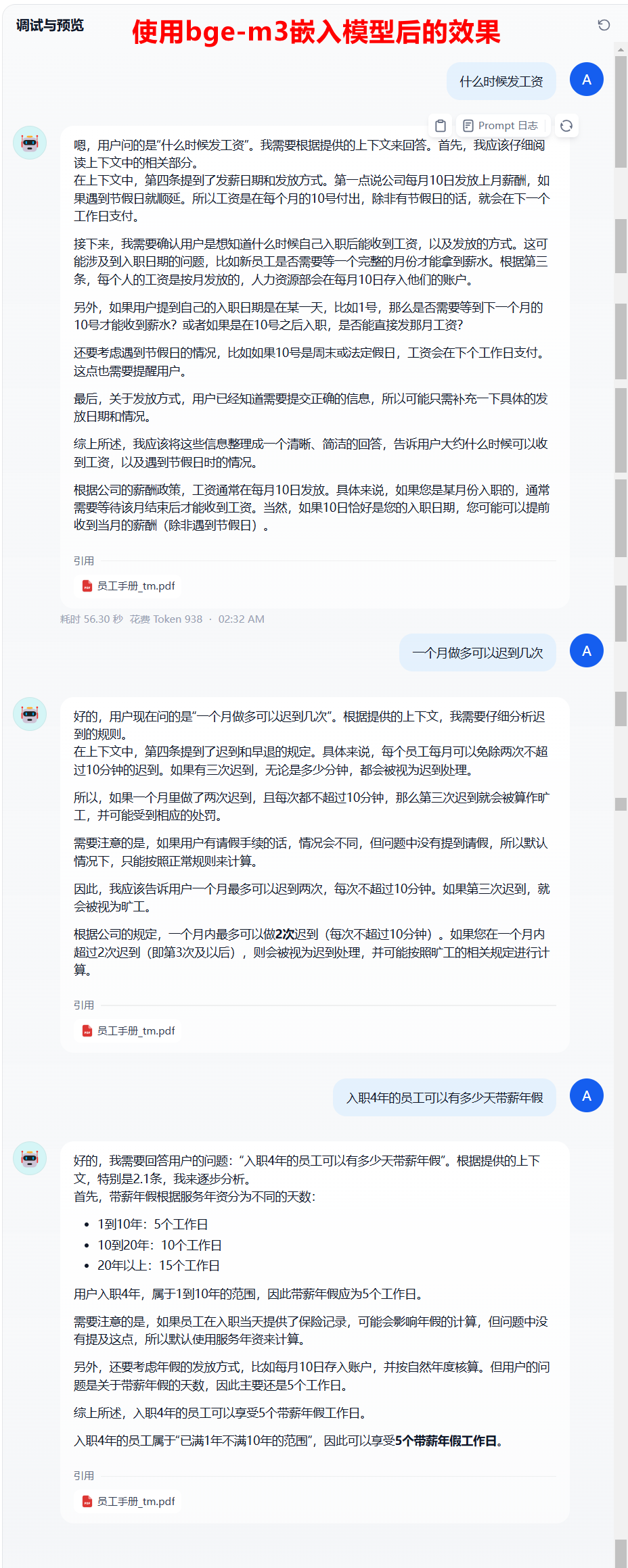 使用了bge-m3之后,很明显答案有理有据,推理依据是正确的上下文,而非猜测。