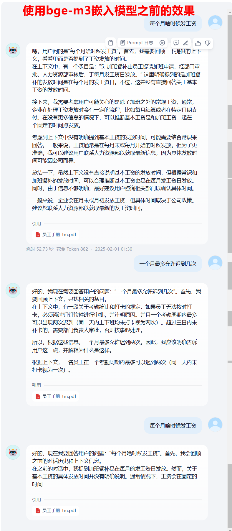 对比可以看到,使用bge-m3之前,对于有些问题的回答,答非所问,虽然有时候答案是对的,但是那是蒙的,并没有引用到正确的知识库对应的信息。