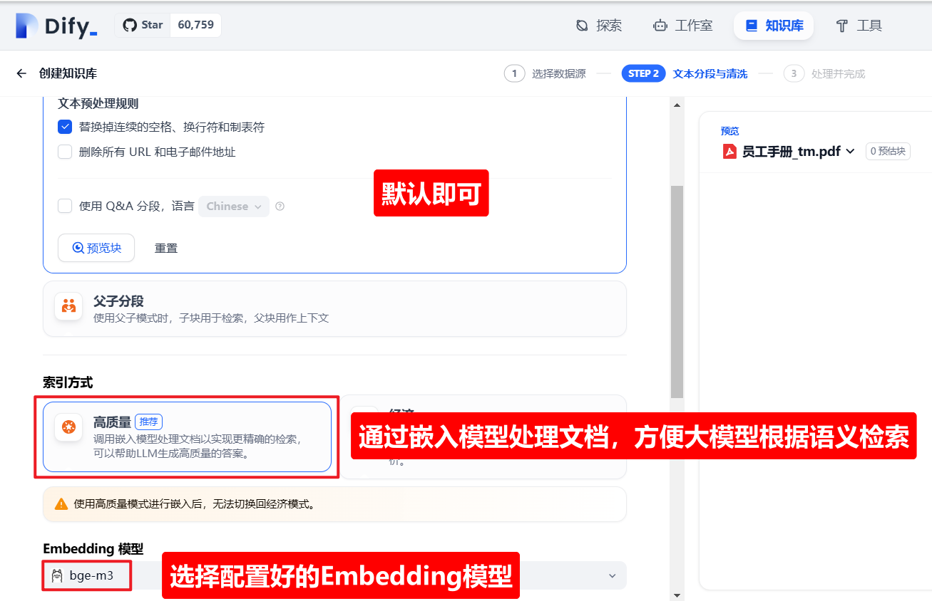 原本为了降低教程难度,我就使用了deepseek-r1模型作为embedding模型来使用了,使用效果也勉强过得去.