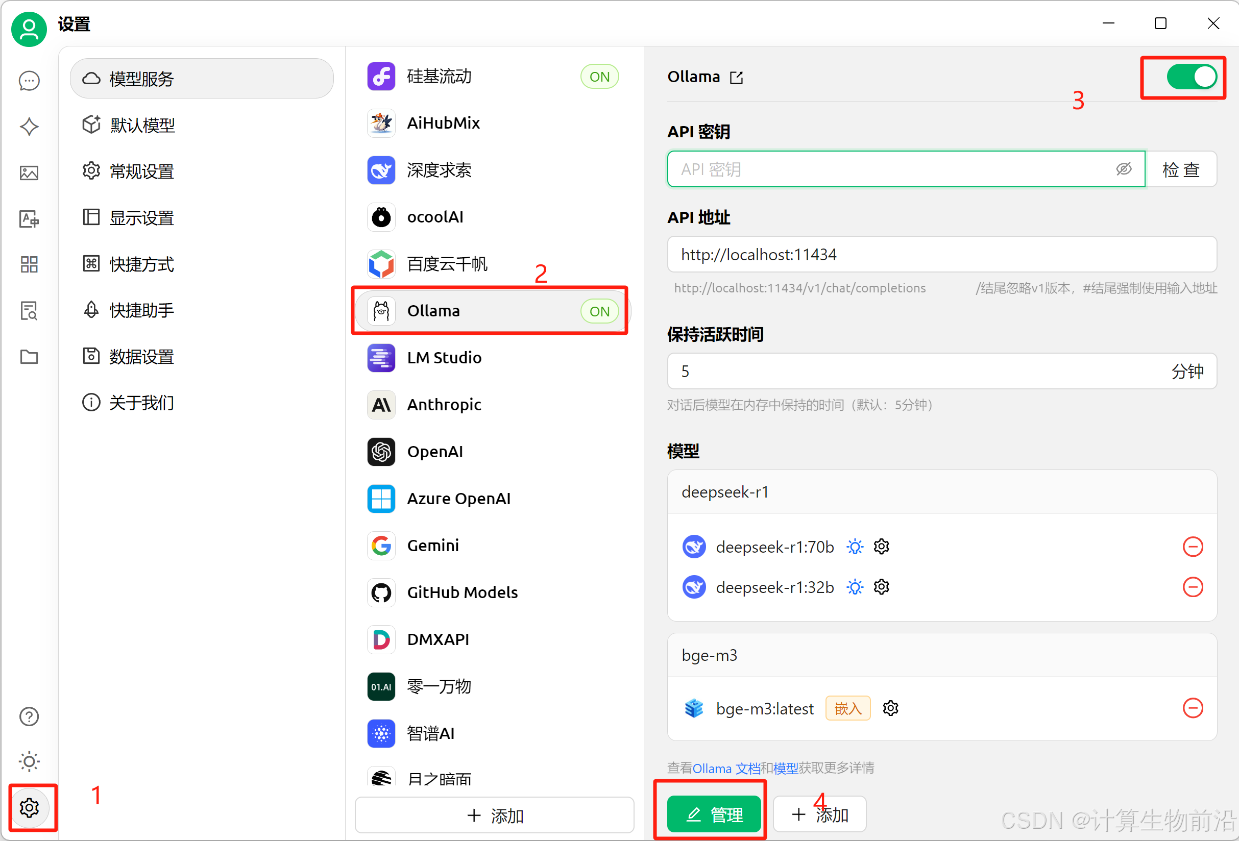 安装完成之后打开软件进行配置,按照图中的流程即可,由于本人还安装了bge-m3和70b,所以会有一些不一样: