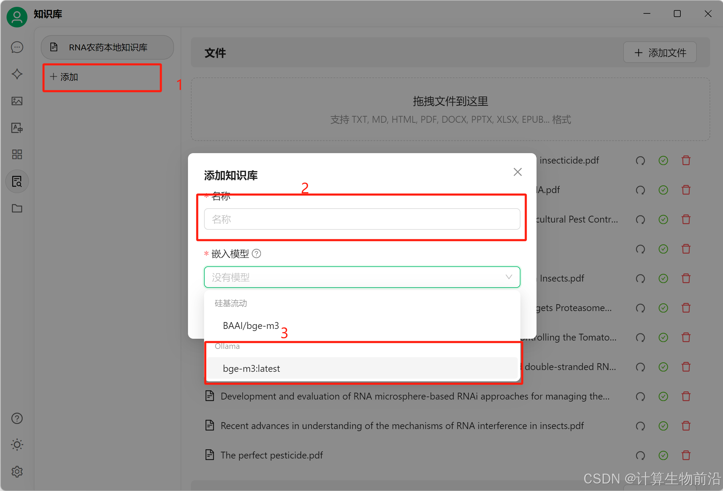 按照下图中的流程即可构建属于你自己的本地库,其中名称可以任填,嵌入模型选择红色框框的(由于你没有配置硅基流动的API,你是不会出现第一个选项的)