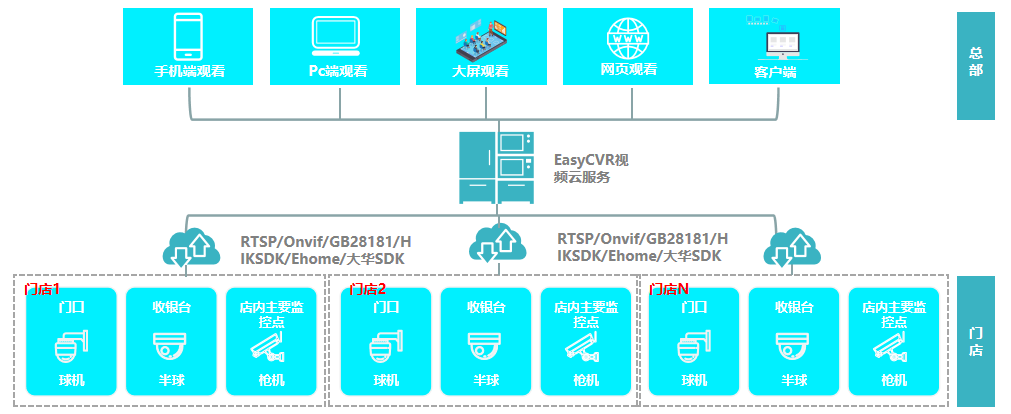 该方案中,各门店的监控设备通过EasyCVR安防视频云服务统一接入,不限摄像头的品牌,目前EasyCVR安防视频云服务基本上可接入市面上100%的标准协议与大多数的私有协议,这样就保证了门店老旧设备的接入,有效对成本进行控制。同时配合云服务的存储,支持对历史数据进行回看。