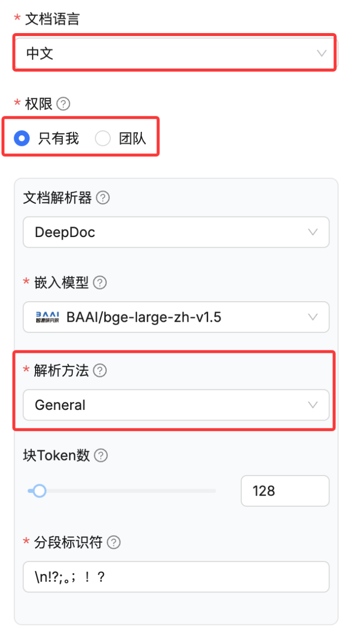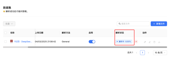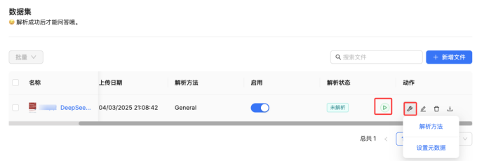 上传文件后,还需要对上传的文件进行解析(解析成功后才能问答哦),可以根据每个文件单独设置解析方法,默认是按照创建知识库时的解析方法进行文件解析;
