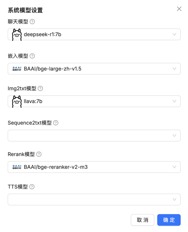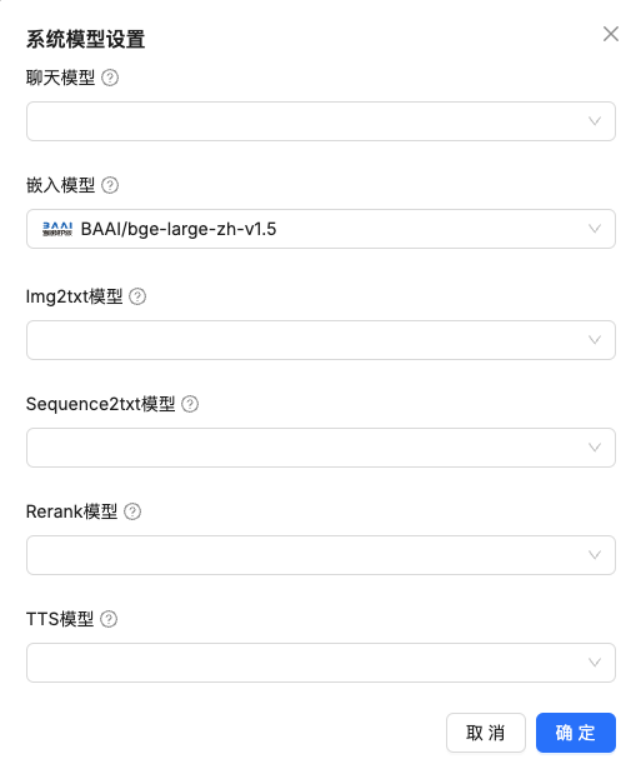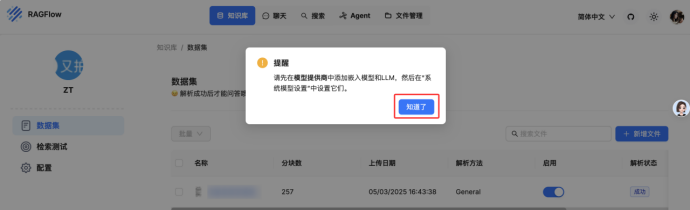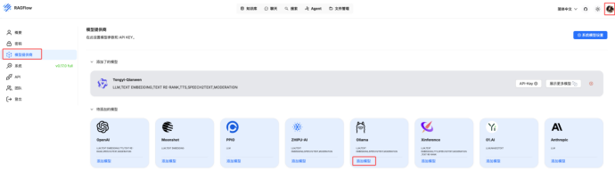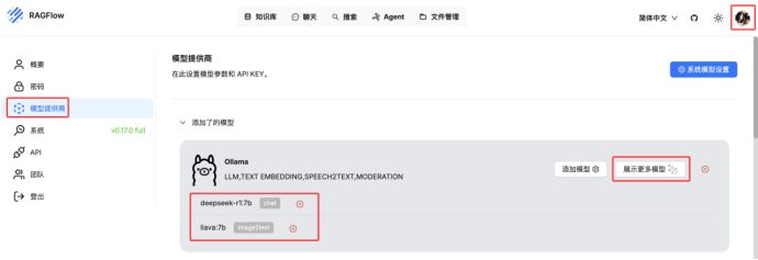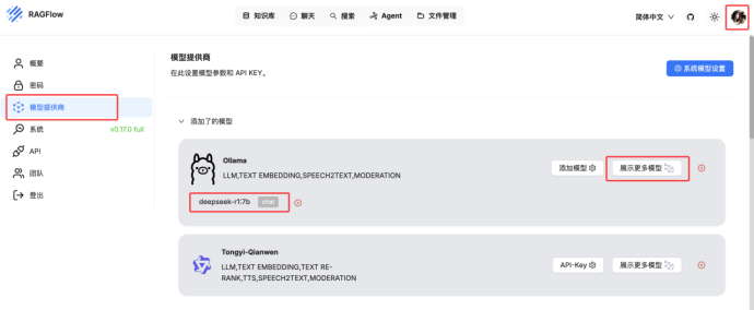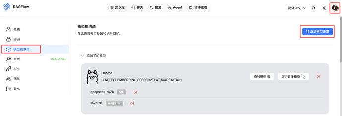 由于我们安装的是ragflow:v0.17.0,所以自带嵌入式模型,如果安装的是ragflow:v0.17.0-slim,则需要自己拉取嵌入式模型,拉取方式可参考Ollama部署与模型下载方式;