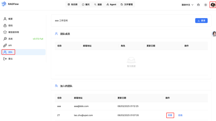 接受邀请后,团队成员可以看到知识库。