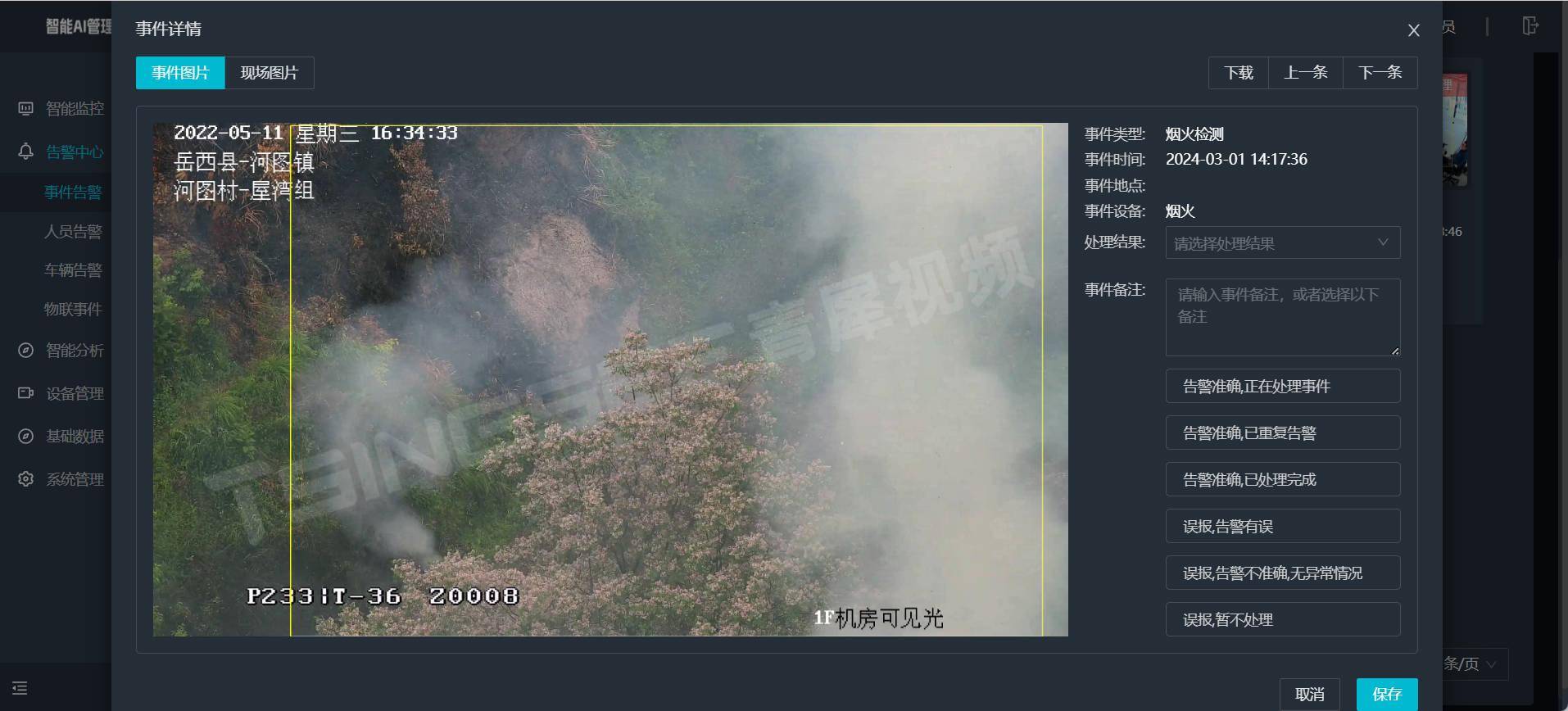 与此同时,AI智能分析网关V4还支持烟雾、火焰识别,可以实时检测电动车充电起火现象,一旦检测到红色、橙色和黄色火焰,或白烟、灰白烟、黄烟、彩烟、黑烟、灰黑烟等不规则的烟雾时,系统将立即抓拍并发出告警信息,提醒管理人员及时查看和处理。
