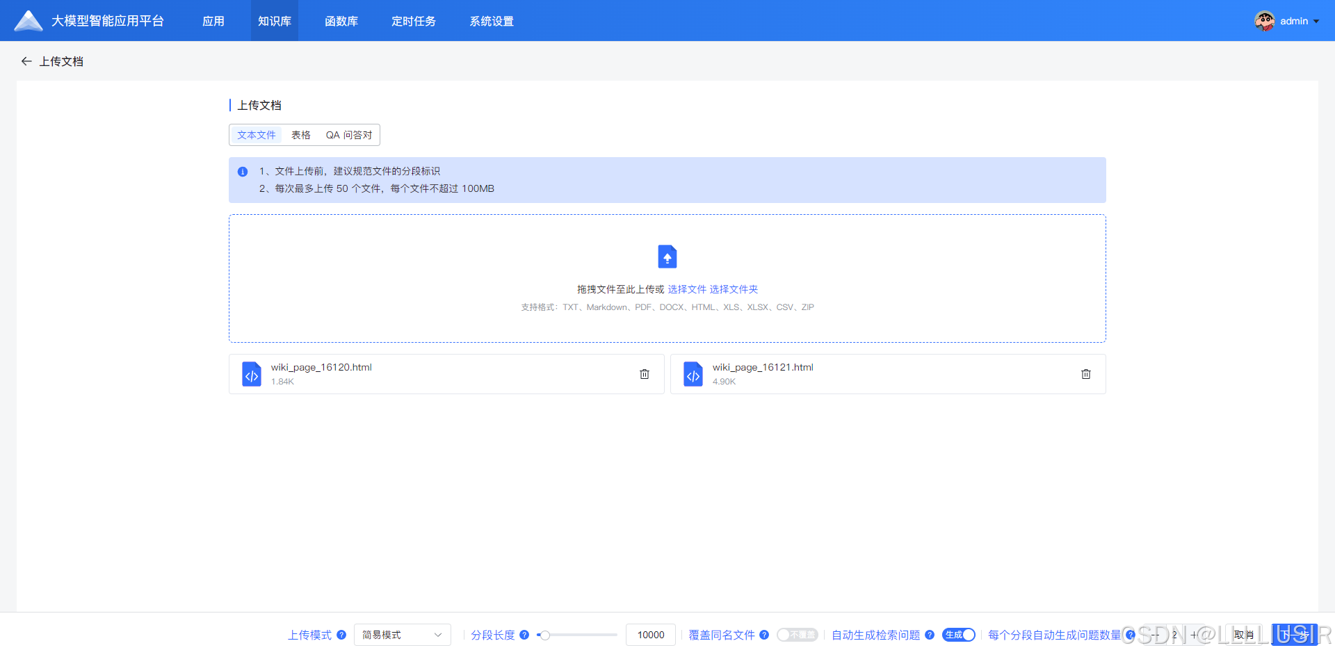 增加了【简易上传】模式,只需要选择文件,配置下面的 分段长度、是否覆盖同名文件、是否自动生成问题及数量后,即可自动创建成功,不需要手动确认 分段效果、手动勾选生成问题