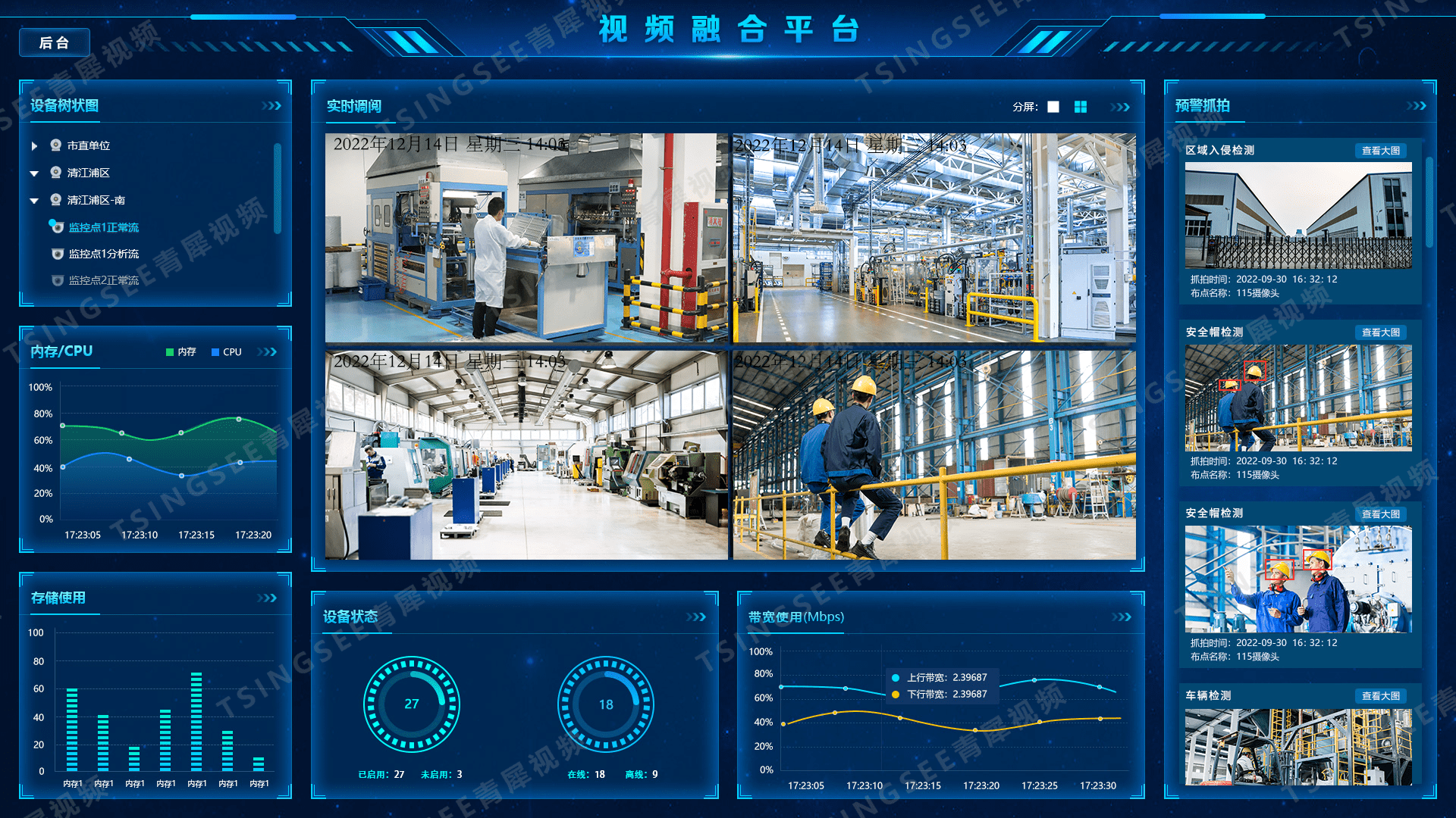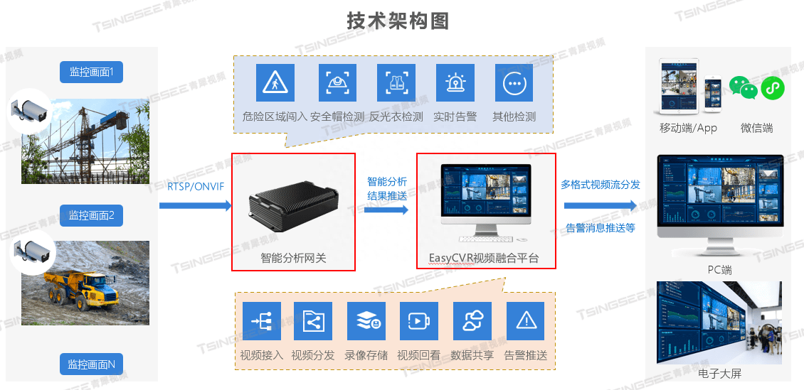 视频监控/安防监控/视频存储TSINGSEE青犀视频智能分析平台可以在监控范围内划定特定区域,有人员入侵该区域就会自动识别报警,并且立即发送到后台,通知管理人员,无须人工干预,实时进行检测,及时预警,可以高效的协助管理者,并最大限度地降低误报和漏报现象。人员闯入危险区/入侵识别技术AI智能分析预警可以广泛运用在学校、园区、工地、火车站台、地铁、厂区等地方。