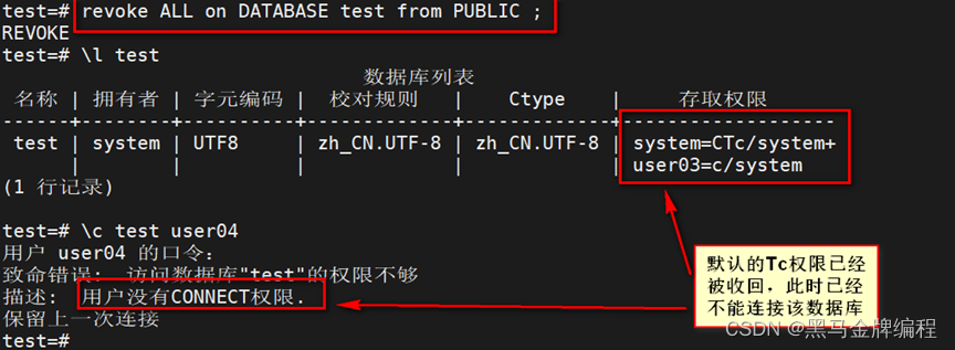 revoke ALL on DATABASE 数据库名 from PUBLIC ;