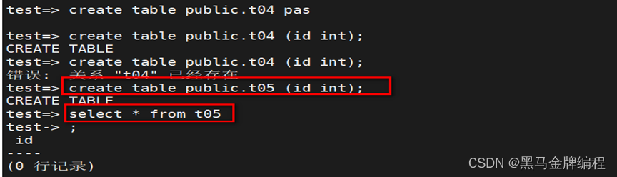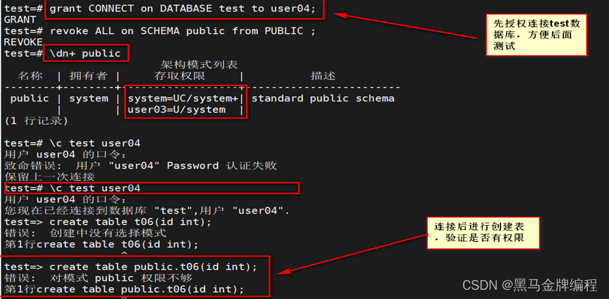 验证:收回权限后已经无法在public模式中创建表了。