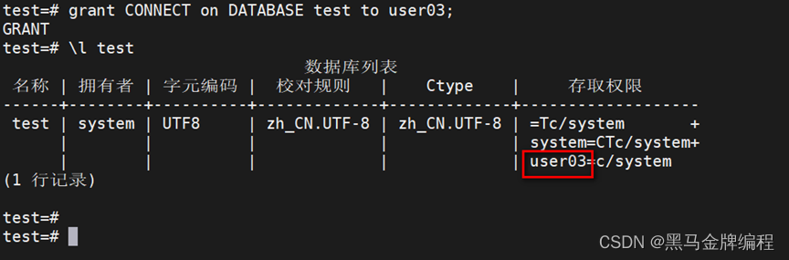 上图显示授予了查询权限给user03用户