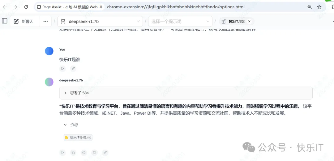 ▍通过以上测试,DeepSeek已经可以结合我们刚才投喂的新知识较好的回答【快乐IT】是谁的问题