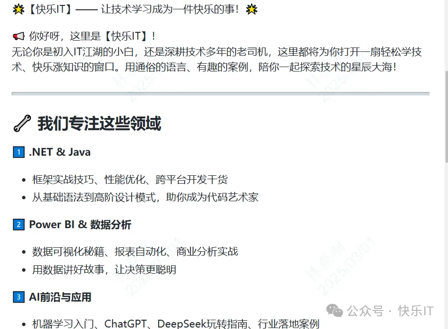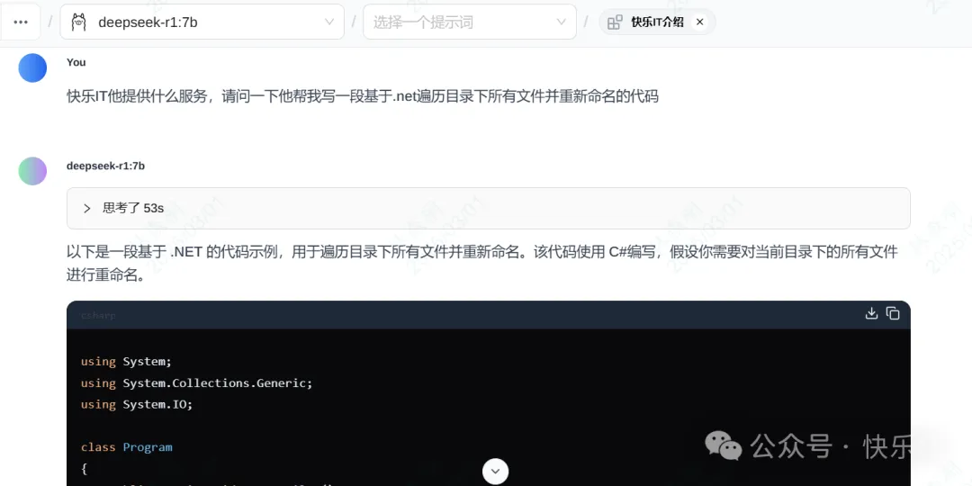 ▍通过以上测试,DeepSeek已经可以结合我们刚才投喂的新知识较好的回答【快乐IT】是谁的问题注:如果还没生效,可以刷新一下页面看看▍然后,我继续问:快乐IT他提供什么服务,请问一下他帮我写一段基于.net遍历目录下所有文件并重新命名的代码五、🔍总结1、DeepSeek本地化部署可以参照:DeepSeek本地化部署超简单,比装个office还简单2、本文通过Markdown文件把新知识喂养给D