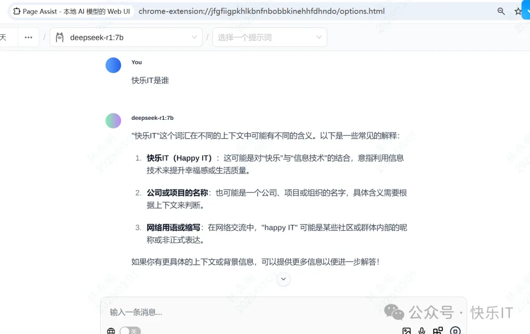 四、🔍 效果验证,测试DeepSeek是否认识【快乐IT】