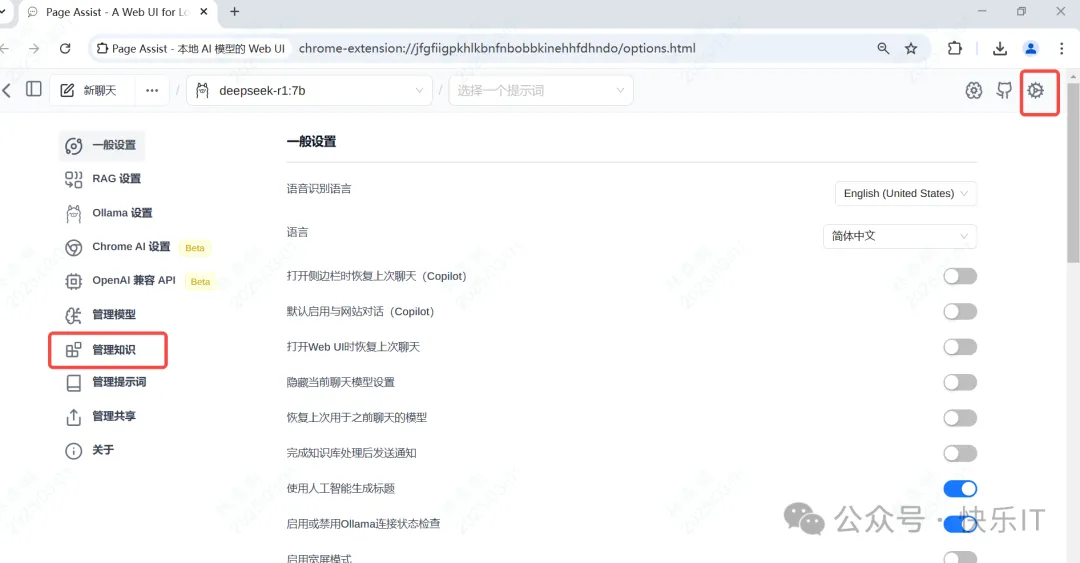 打开Page Assist,并把刚准备的知识,通过添加新知识上传给DeepSeek: