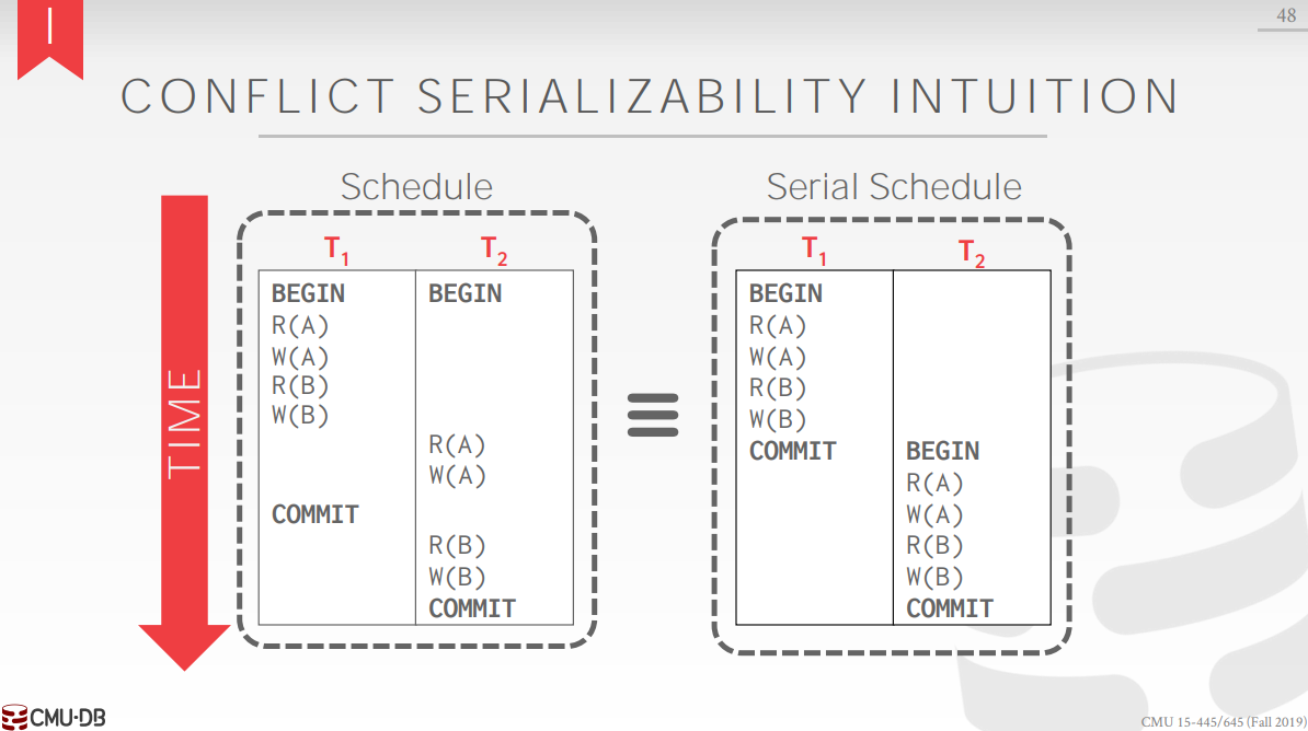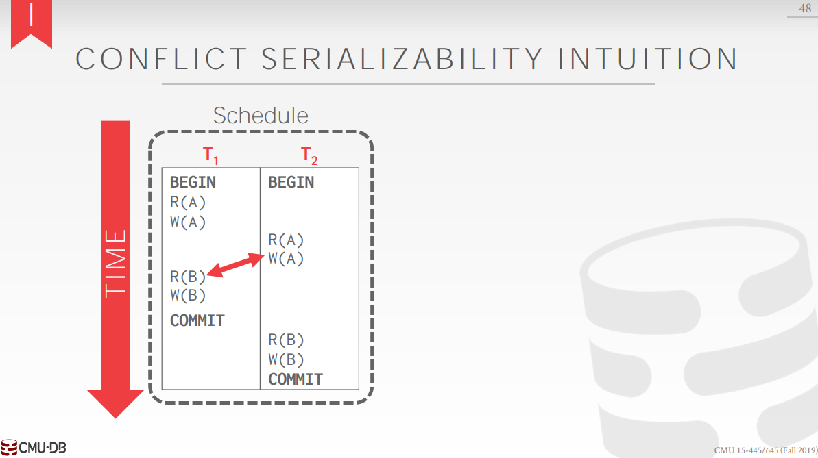 对于下图所示的调度,可以看到里面存在冲突,T1 和 T2 中都存在读写操作。由于 R(B) 和 W(A) 、W(B) 和 R(A) 互不影响,我们可以通过调整他们的顺序,实现和串行化相同的效果,这时候称为冲突可串行化。