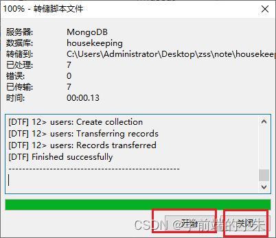 第六步:接着会弹出转储脚本文件对话框,点击开始按钮就会进行开始转储,转储完毕之后点击关闭按钮即可